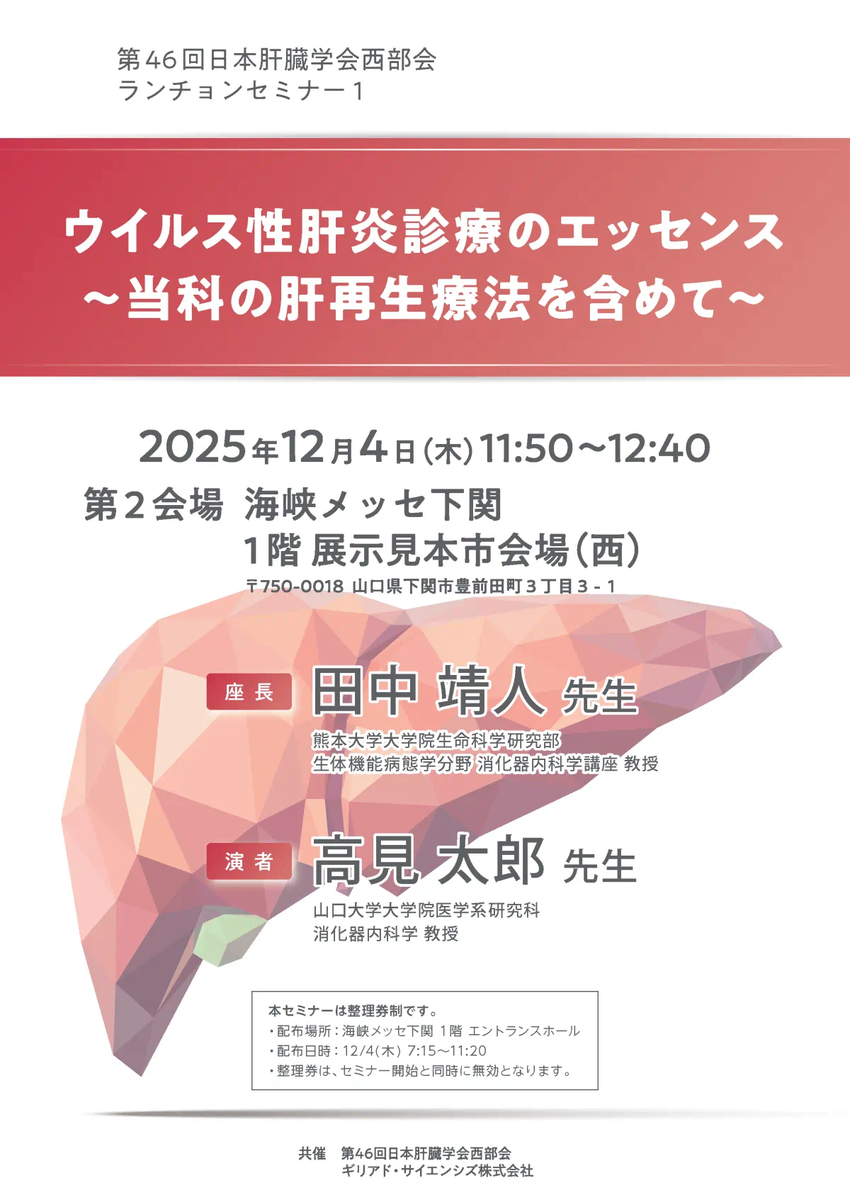 今回のランチョンセミナーではB型肝炎、C型肝炎治療における最新の知見と山口大学で実施している肝再生療法に関する研究内容を中心にご講演いただきます。