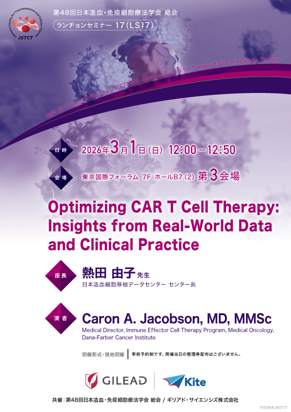 - 本講演会では、Dana-Farber Cancer Institute のDr.Caron Jacobsonをお招きし、DLBCLにおけるCAR T細胞療法の位置づけや意義、リアルワールドデータと臨床から得られた最新のエビデンス等をご講演いただきます。