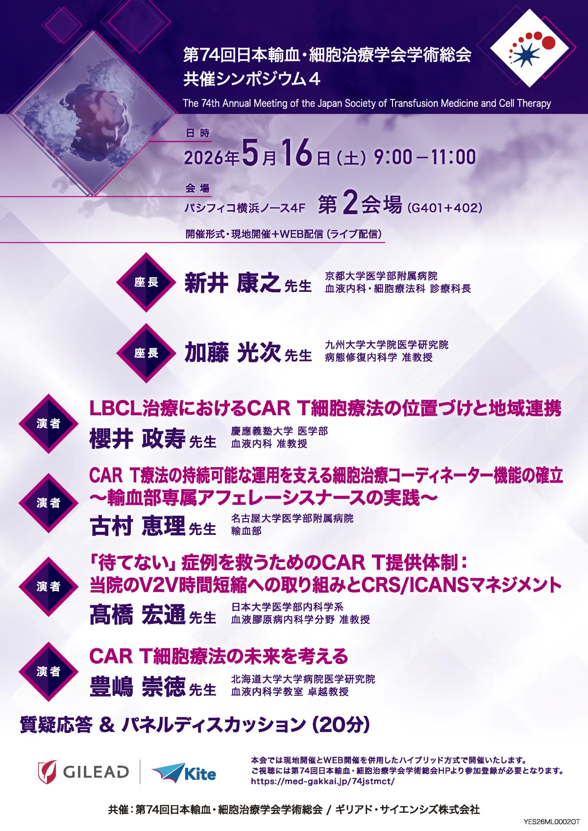 LBCL治療におけるCAR T細胞療法の位置づけと地域連携/CAR T療法の持続可能な運用を支える細胞治療コーディネーター機能の確立 ~輸血部専属アフェレーシスナースの実践~/「待てない」症例を救うためのCAR T提供体制:当院のV2V時間短縮への取り組みとCRS/ICANSマネジメント/CAR T細胞療法の未来を考える