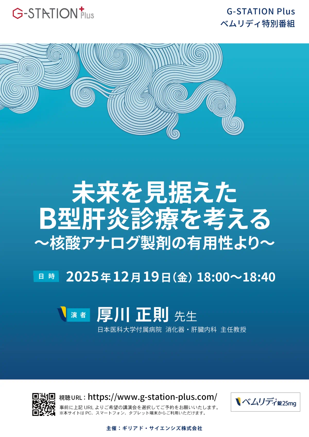また、B型肝炎治療薬「ベムリディ(テノホビル アラフェナミド)*」に関しては、8年間の長期データを中心に、治療における有用性や安全性についてもご紹介いただきます。