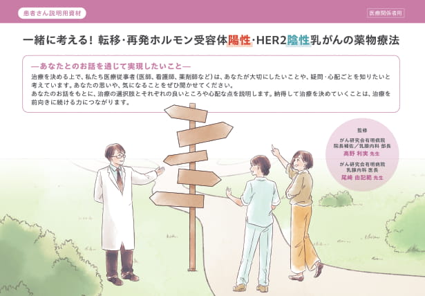 選択肢下敷き転移再発HR+/HER2-mBCの化学療法期の治療をはじめるにあたって患者さんの希望を確認し、化学療法について説明するための資材です。SDM(Shared decision making)ツールとしてお役立てください。資料請求はご施設担当TSへお問い合わせください。