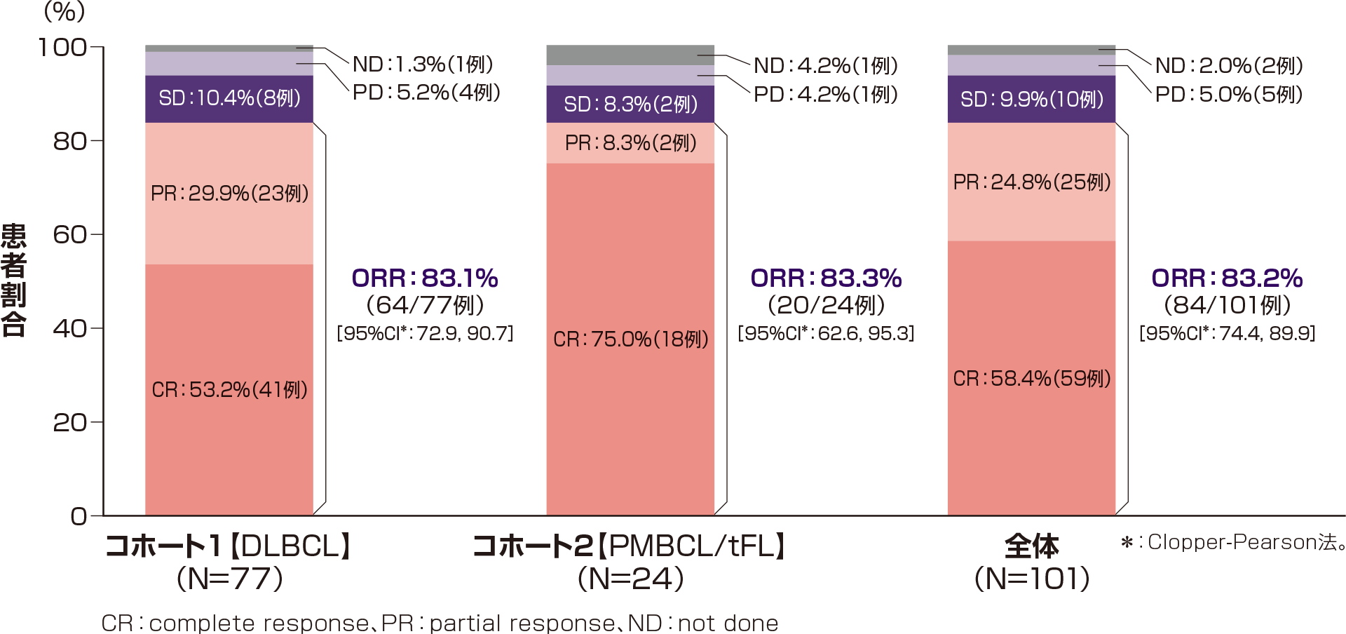 24ヵ月後データ更新時における治験責任医師又は治験分担医師の判定に基づくORR(最良効果)[95%CI]は83.2[74.4, 89.9]%でした。 また、CR率は58.4%、PR率は24.8%でした。