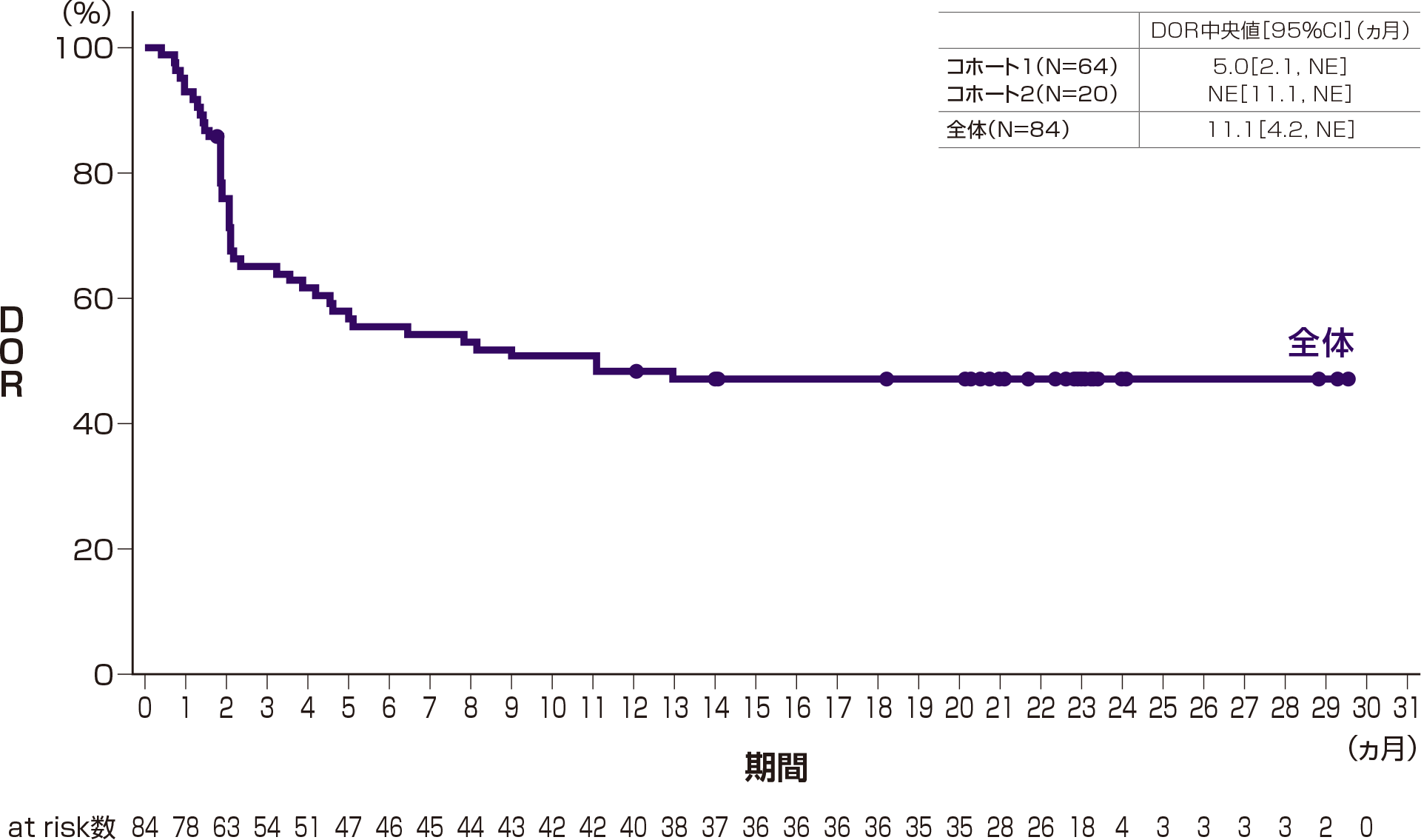24ヵ月後データ更新時におけるDORの中央値[95%CI]は11.1[4.2, 推定不能]ヵ月でした。