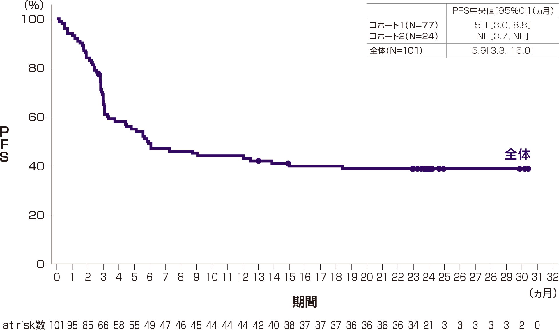 24ヵ月後データ更新時におけるPFSの中央値[95%CI]は5.9[3.3, 15.0]ヵ月であり、24ヵ月後のPFSのKaplan-Meier推定値は38.9%でした。