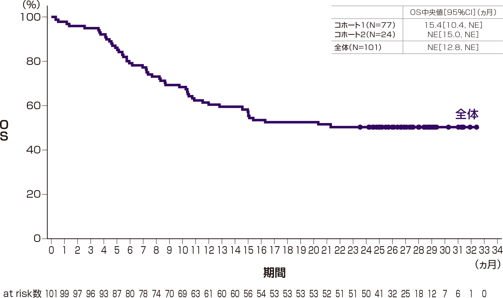 24ヵ月後データ更新時におけるOSの中央値は推定できませんでしたが、24ヵ月後のOSのKaplan-Meier推定値は50.5%でした。