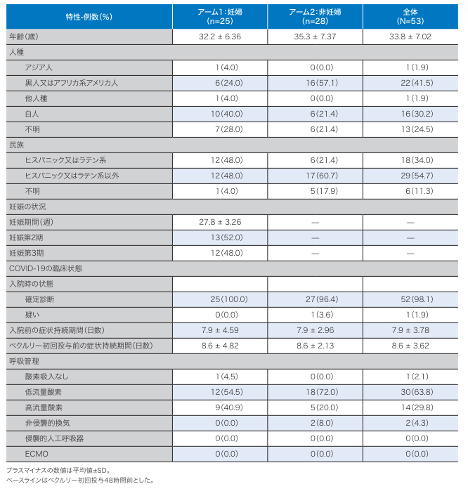 | 対象 | 試験開始時にCOVID-19と診断され、ベクルリーを投与された妊婦25例(アーム1)及び妊娠する可能性がある非妊婦28例(アーム2) |