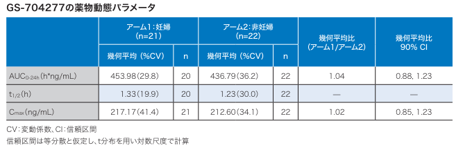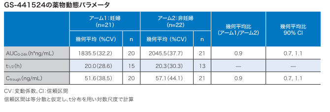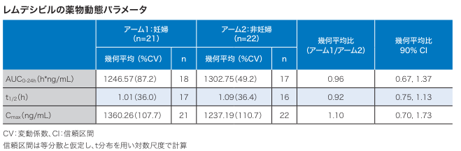 | 解析計画 | (サンプルサイズ)妊婦の薬物動態の結果が非妊婦の薬物動態の結果の30%以内であるかどうかを示せる試験になるよう、各群で少なくとも20例のサンプルサイズが選択された。 (薬物動態)薬物動態は、薬物動態評価解析集団を用いて解析された。投与前から点滴終了後3時間、点滴終了後5時間、7時間、点滴終了後23時間の4検体中3検体が採取された被験者が解析集団に含まれた。R2<0.75の被験者は、λz、t1/2、及びVzのパラメータサマリーから除外された。レムデシビル及びその代謝物の血漿中濃度及び薬物動態パラメータは、アーム別及び妊娠期間別(該当する場合)に記述統計を用いて要約した。さらに、薬物動態パラメータの幾何平均値(レムデシビルAUC、t1/2、GS-441524 Ctrough)と90%信頼区間(CI)をアーム別に示した。また、レムデシビルAUC、t1/2、GS-441524 Ctroughについて、アーム1とアーム2の幾何平均比の90% CIも算出した。 (安全性)安全性は、ベクルリーが投与された全症例を含む安全性解析集団を用いて解析された。投与期間中から最終投与後4週間までと、分娩期間中(アーム1のみ)に発現した有害事象の例数と発現率を群別にまとめた。臨床検査値及びバイタルサインも同様にまとめた。分娩転帰及び新生児身体検査の結果は、アーム1について要約した。 |