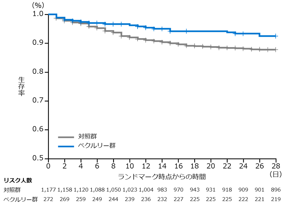 - ランドマーク時点から28日間のうちに、ベクルリー群の19例(7.0%)および対照群の136例(11.6%)が死亡もしくはIMV/ECMO開始に至りました。