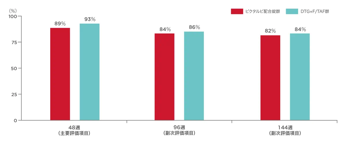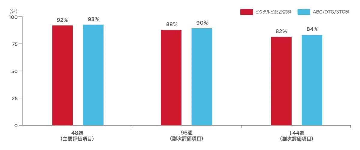 抗HIV薬による治療経験がないHIV-1感染症患者を対象とした1490試験で、ビクタルビ配合錠群のウイルス学的成功*率は、事前に計画された投与開始48週、96週、144週における解析において、89%、84%、82%であり、各時点において対照群に対する非劣性が示されました†。