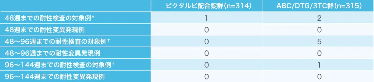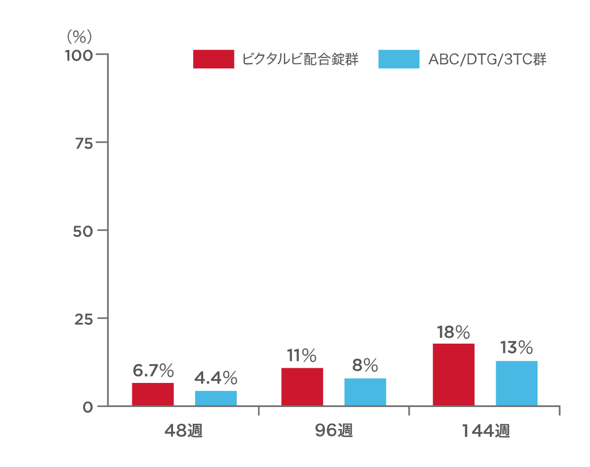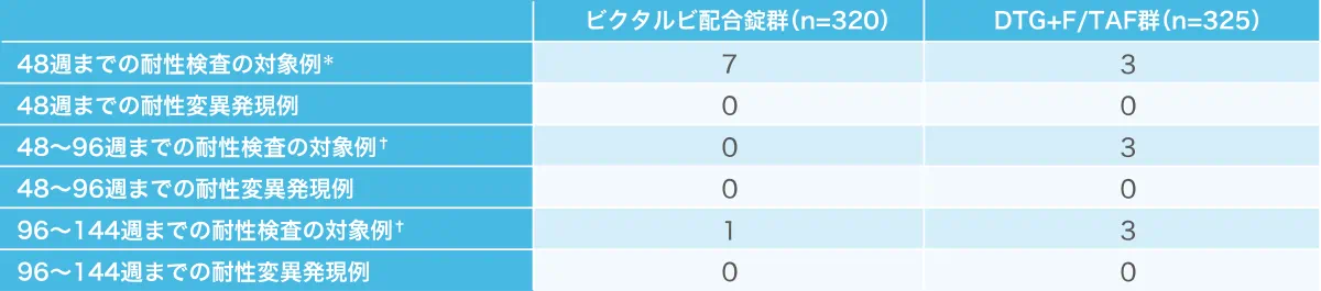 投与144週時点あるいは治療中の最後の検査において血漿中HIV-1 RNA量が50 copies/mL以上であったのは、ビクタルビ配合錠群で2例(1%)、対照群で9例(3%)でした。有効性が認められないことを理由にした投与中止は観察されませんでした。ビクタルビ配合錠群の2例のうち1例、対照群の9例のうち7例は、その他の理由‡による投与中止例であり、投与中止前の最後のHIV-1 RNA量が50 copies/mL以上でした。