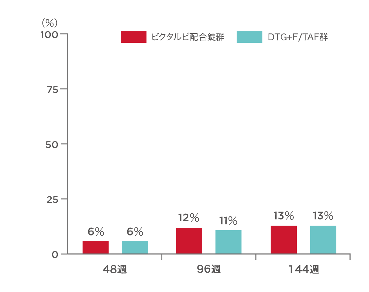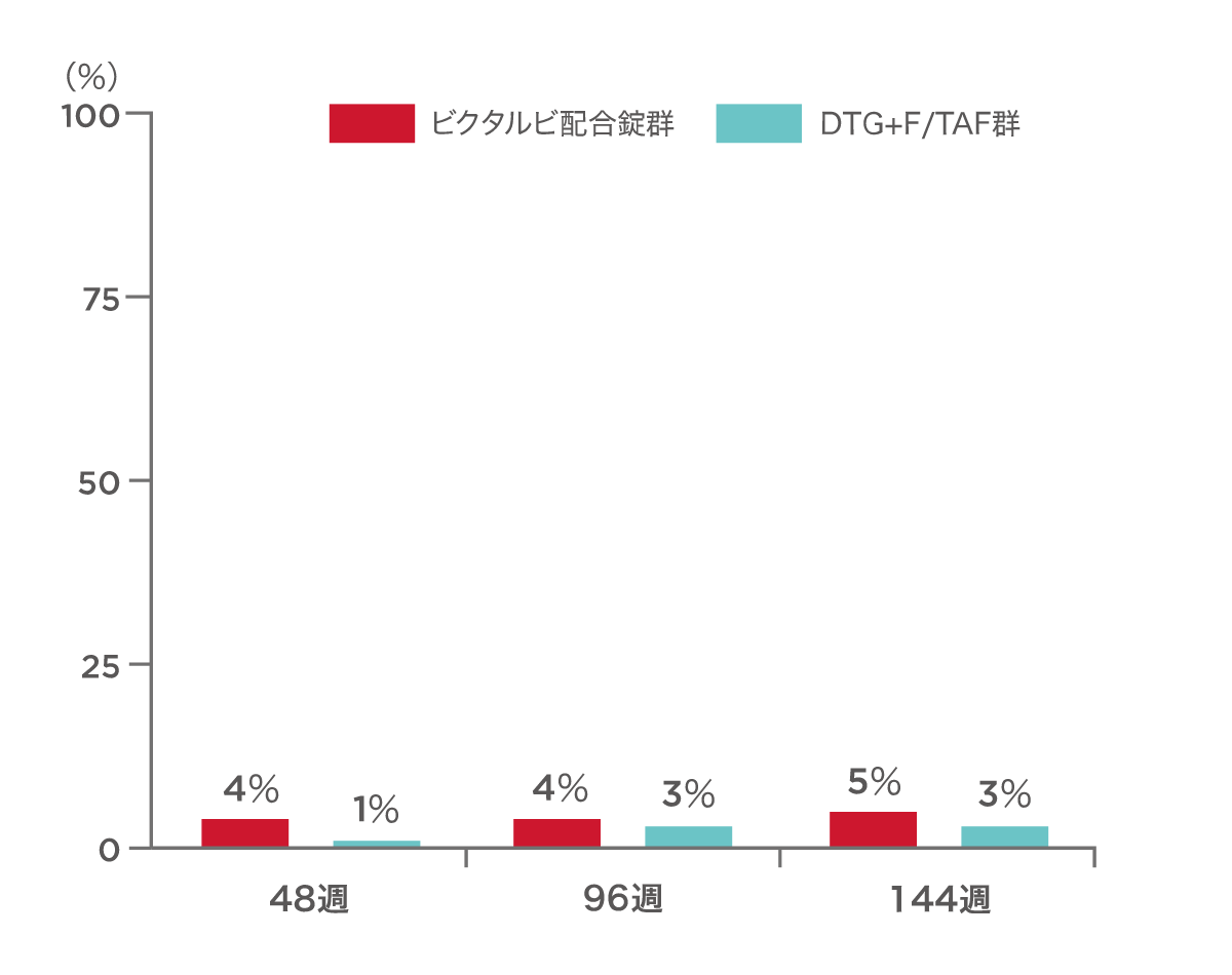 投与144週時点あるいは治療中の最後の検査において血漿中HIV-1 RNA量が50 copies/mL以上であったのは、ビクタルビ配合錠群で15例(5%)、対照群で10例(3%)でした。有効性が認められないことを理由にした投与中止は観察されませんでした。ビクタルビ配合錠群の15例のうち14例、対照群の10例のうち6例は、その他の理由‡による投与中止例であり、投与中止前の最後のHIV-1 RNA量が50 copies/mL以上でした。