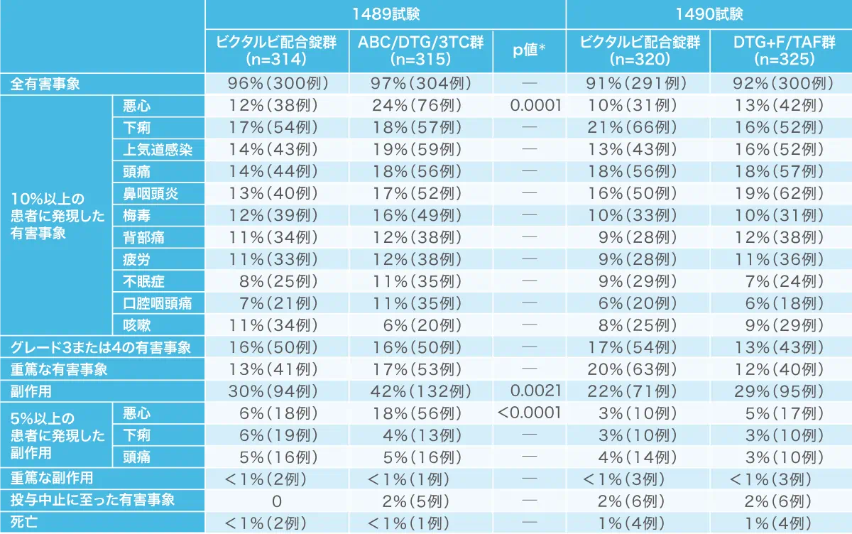 1489試験では、重篤な副作用として、ビクタルビ配合錠群で全身性強直間代性発作、自然流産各1例、ABC/DTG/3TC群で胃腸炎、脂肪便、慢性膵炎1例が認められました。投与中止に至った副作用は、ビクタルビ配合錠群では認められませんでした。ABC/DTG/3TC群では、悪心と全身性皮疹1例、血小板減少症1例、慢性膵炎と脂肪便1例、うつ病1例が認められました。死亡はビクタルビ配合錠群で2例(ドラッグの過剰摂取、自殺各1例)、ABC/DTG/3TC群で1例(ドラッグの過剰摂取)認められましたが、治験薬との関連は否定されました。