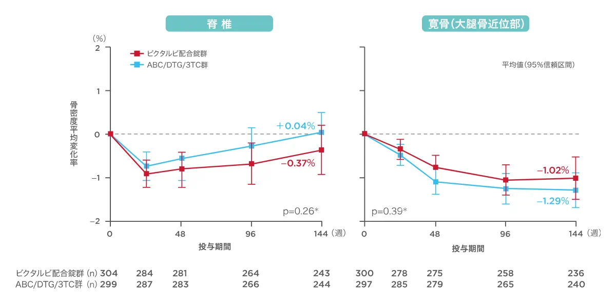 1489試験において、投与開始144週の脊椎と寛骨(大腿骨近位部)の骨密度の変化率は、ビクタルビ配合錠群で-0.37%、-1.02%、ABC/DTG/3TC群で+0.04%、-1.29%であり、投与群間で同様の結果でした。
