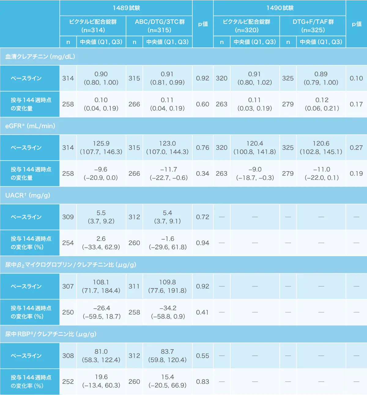 1489試験および1490試験における、投与開始144週の腎バイオマーカーの変化は投与群間で同様の結果でした。