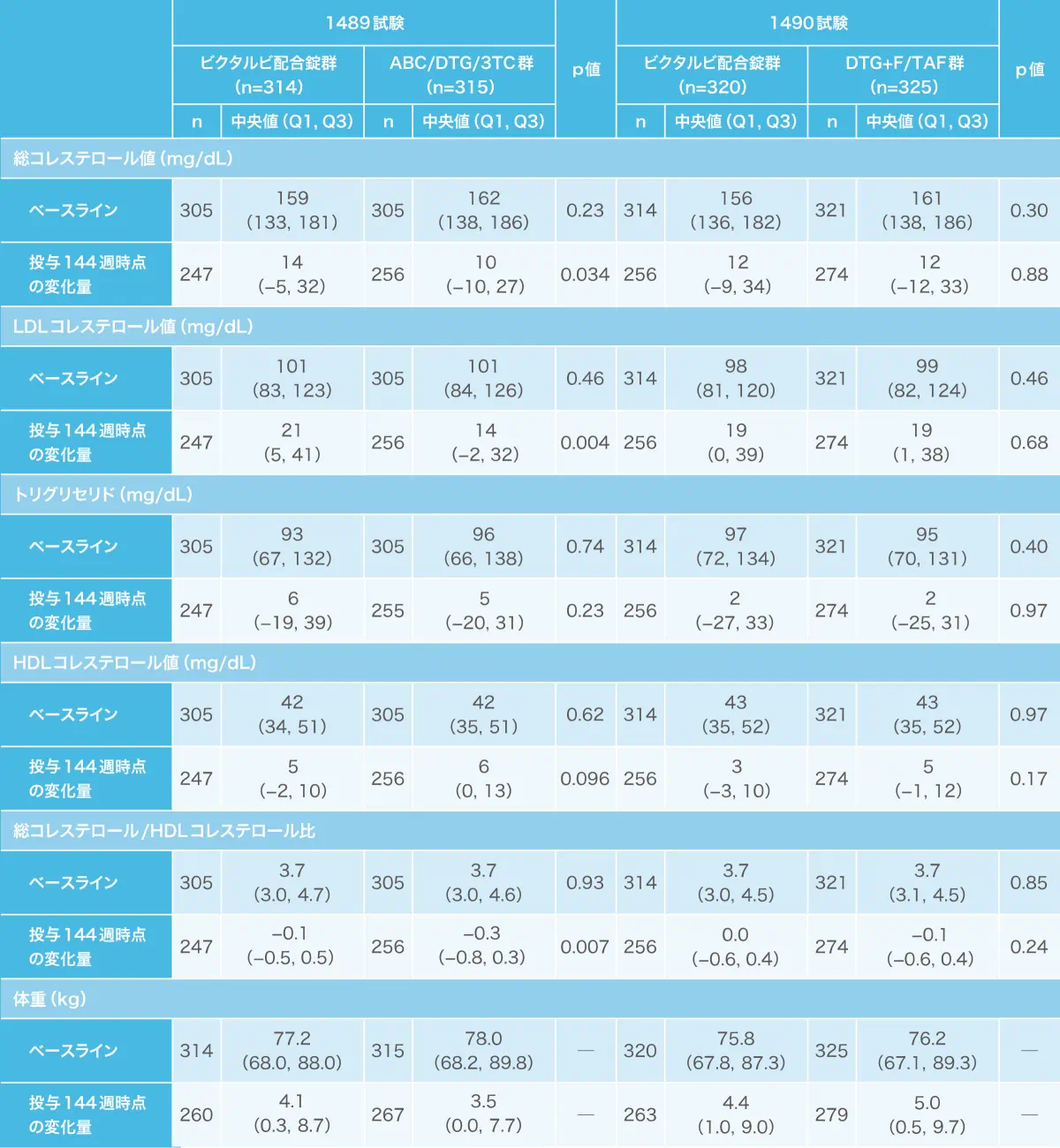 1489試験および1490試験において、投与開始144週の脂質パラメータおよび体重の変化が検討されました。