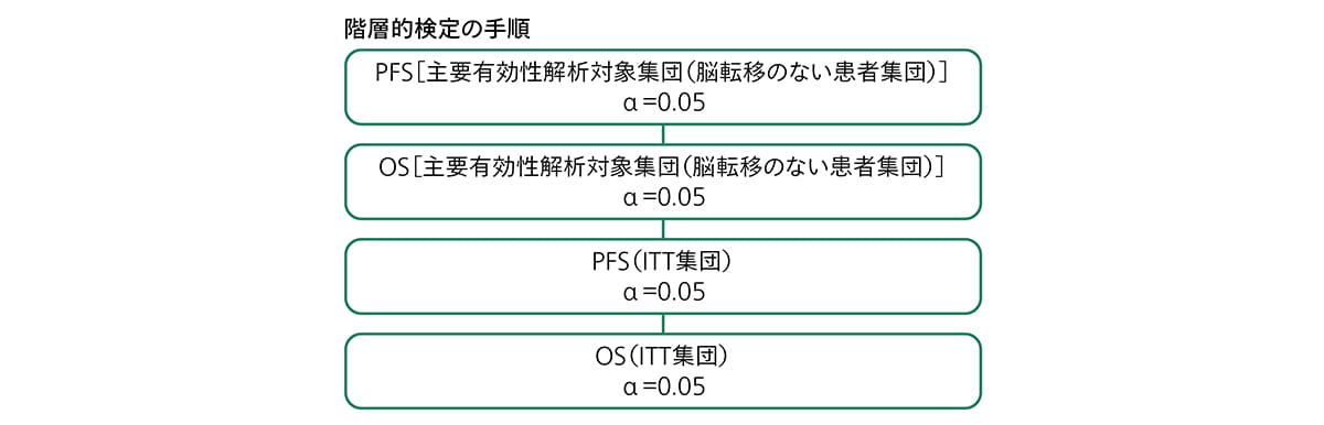 【主要評価項目】 無増悪生存期間(PFS)*1〈主要有効性解析対象集団(脳転移のない患者集団)〉[検証的な解析項目] 【副次評価項目(階層的検定の手順により多重性を調整)】 PFS〈ITT集団〉*1、全生存期間(OS)〈主要有効性解析対象集団(脳転移のない患者集団)、ITT集団〉[検証的な解析項目] 【その他の副次評価項目】 奏効率(ORR:完全奏効[CR]+部分奏効[PR])*1,2、奏効までの期間(TTR)*1,2、奏効期間(DOR)*1,2、臨床的有用率(CBR:CR+PR+6ヵ月以上の安定[SD])*1,2〈以上、主要有効性解析対象集団(脳転移のない患者集団)、ITT集団〉、安全性(有害事象 等)等 【探索的評価項目】 免疫原性 *1:RECIST第1.1版に基づくIRC判定による評価 |